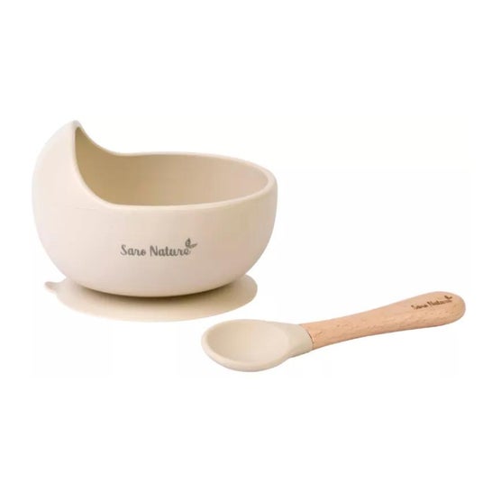 Conjunto de louça de mesa cor de areia feita de madeira de faia e silicone de qualidade alimentar. Ajuda a alimentar os mais pequenos e a criar hábitos saudáveis com o ambiente. Tem também propriedades antibacterianas que promovem a saúde dos bebés. Contém uma taça com uma ventosa prática na base, o que ajuda a prevenir derrames. Microondas, forno, congelador e máquina de lavar louça seguros. Vem completo com uma colher ergonómica que facilita a aderência e estimula as capacidades motoras dos bebés.