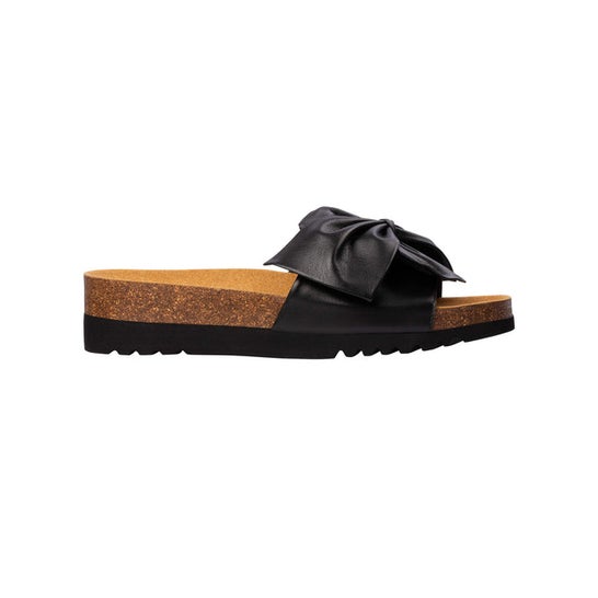 Sandálias pretas com sola de cortiça. Têm um calcanhar ligeiramente plano de 5cm e têm um laço que segura o pé à frente. Ajudam a manter o pé descansado graças à sua palmilha têxtil.