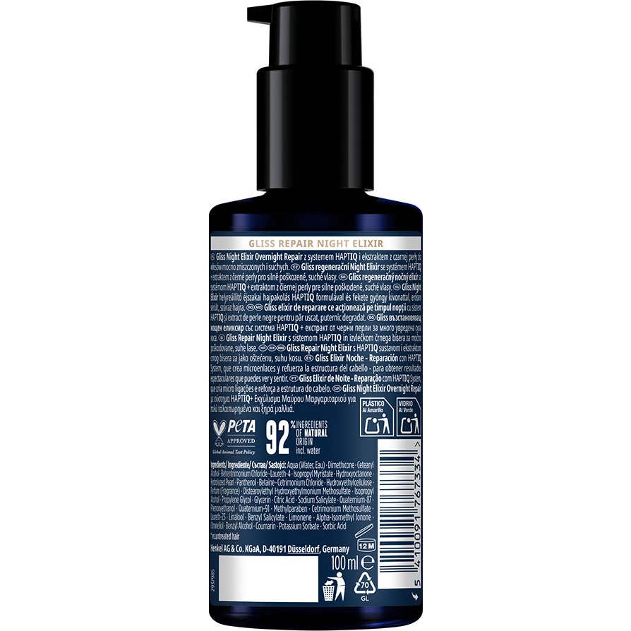 Schwarzkopf Gliss Night Elixir Sérum Cabelo Danificado é um tratamento específico projetado para cabelos muito danificados e secos. Este sérum, que se apresenta em um formato de 100 ml, incorpora Extrato de Pérola Negra e o inovador HaptIQ System, que atuam em conjunto para criar microeligações na fibra capilar.