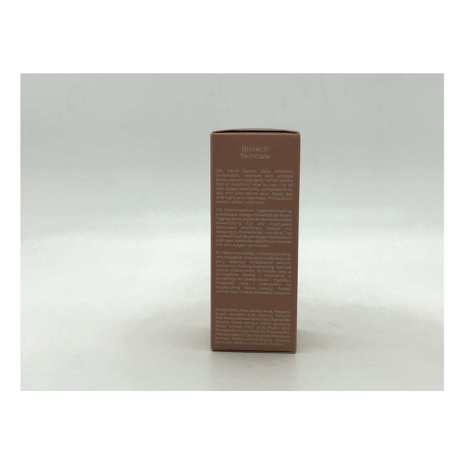 Soro de renovação da superfície da pele desenvolvido com 2% de ácido salicílico obtido a partir de casca de salgueiro. Ajuda a desobstruir poros inflamados com uma acção esfoliante, eliminando células mortas acumuladas. Contém ácidos mandélico, cítrico e fítico, que ajudam a regular a produção de sebo no rosto e a prevenir as marcas de acne. Enriquecidos com extractos de aveia, camomila e malva, que proporcionam propriedades suavizantes, anti-sépticas, calmantes, emolientes e antioxidantes. Adequado para combinação com pele oleosa. Adequado para veganos.