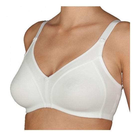 Isso garante uma fixação ótima e cobertura total. Confeccionado em tecido de algodão respirável, este sutiã incorpora bolsos internos que asseguram a prótese de forma discreta. Seu design não possui aros e enchimento, o que evita atritos e proporciona suavidade, adaptando-se à anatomia feminina.