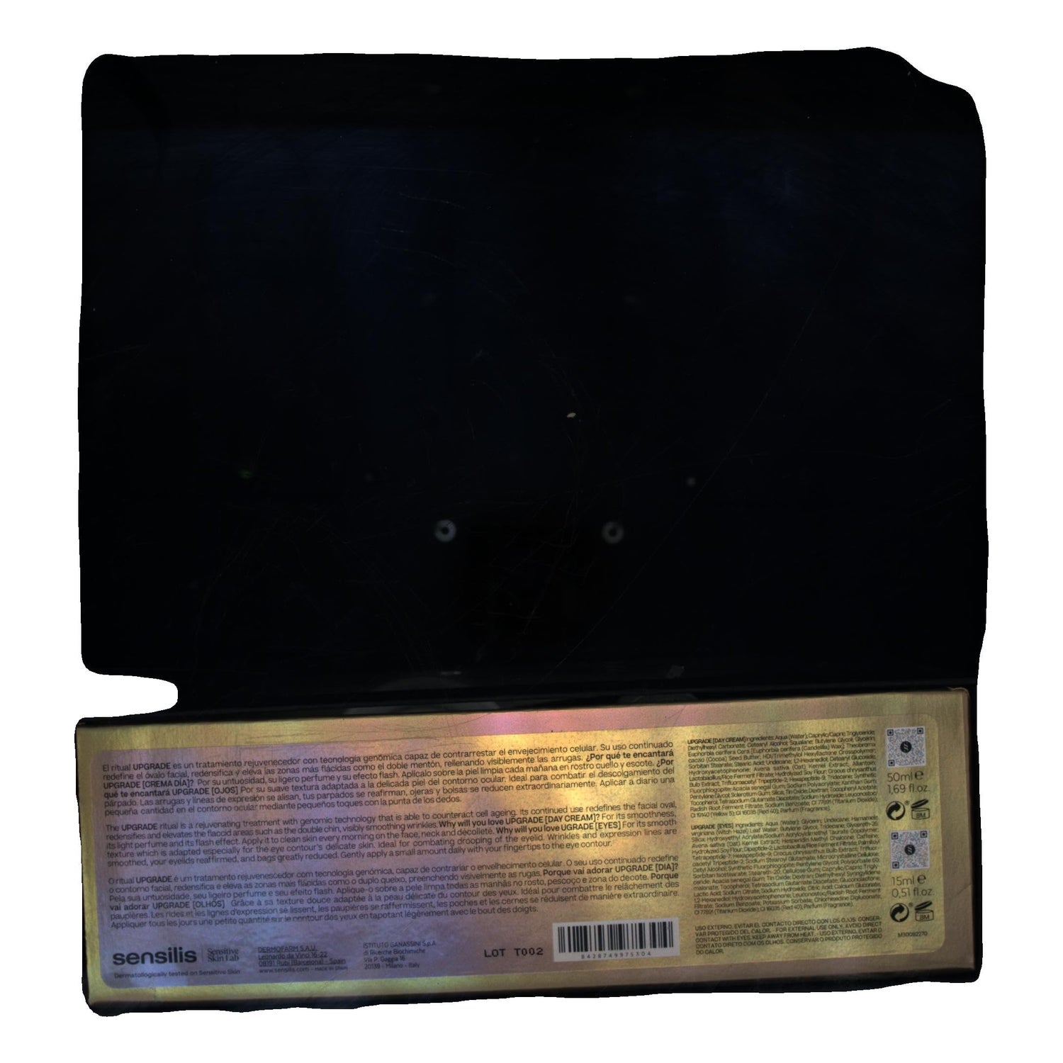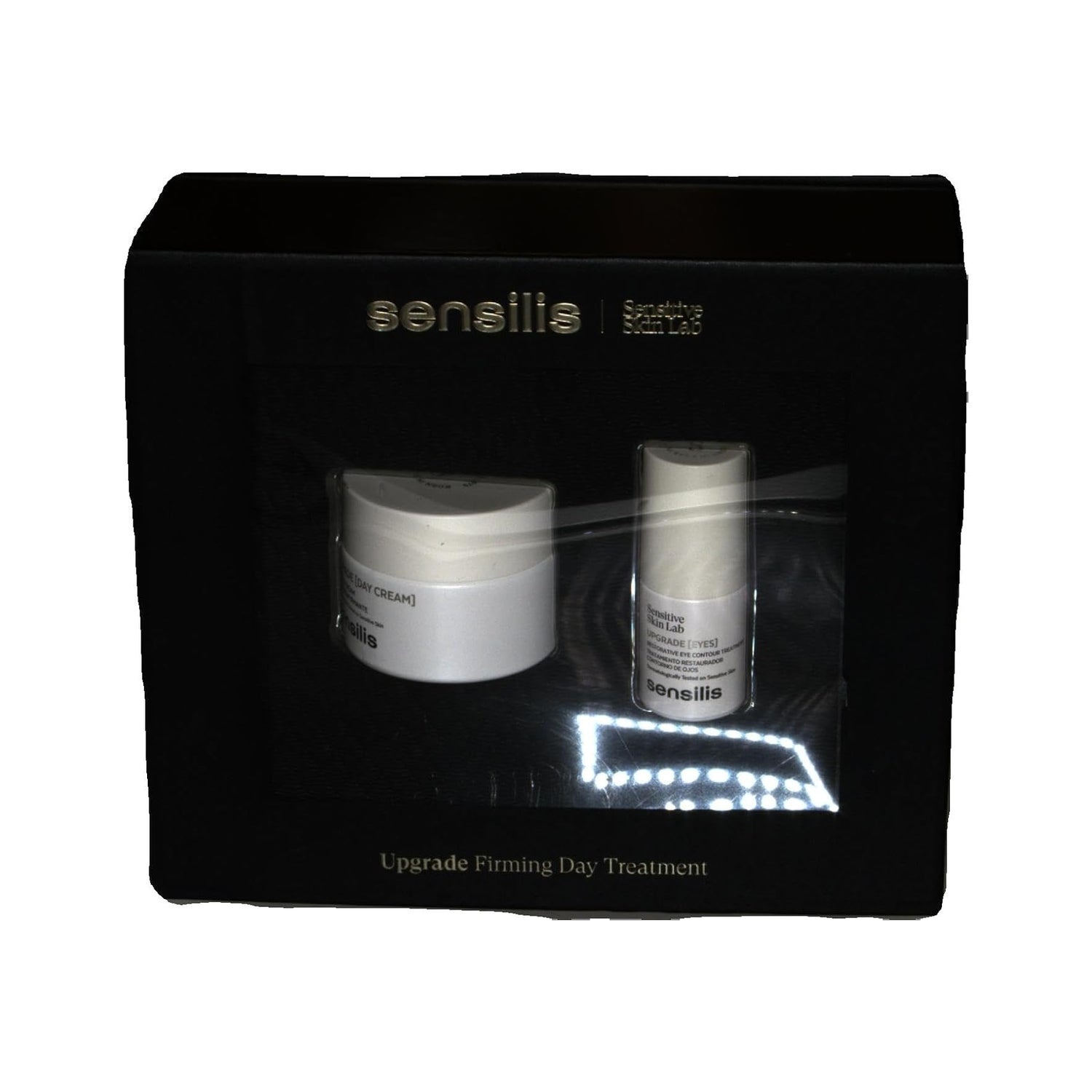 Este cofre inclui um creme de dia com efeito reafirmante imediato e um contorno de olhos Upgrade. O creme de dia, em um formato de 50 ml, é uma emulsão densa e rica que se espalha facilmente e é rapidamente absorvida, proporcionando um efeito lifting instantâneo e um alisamento notável da pele.