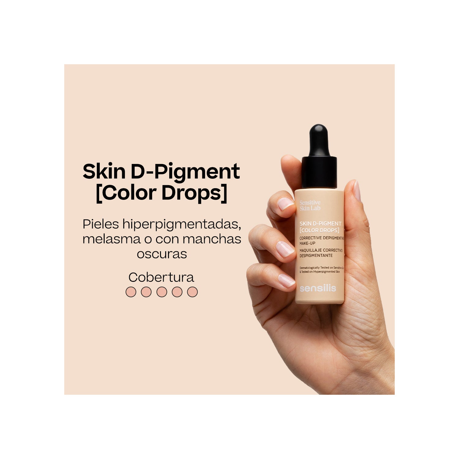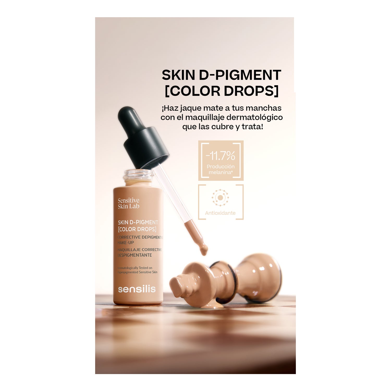 Sensilis Skin D-Pigment [Color Drops] Depigmenting Corrective Makeup 02 Sand 30ml é uma base com uma textura fluida e uma cobertura modulável.
