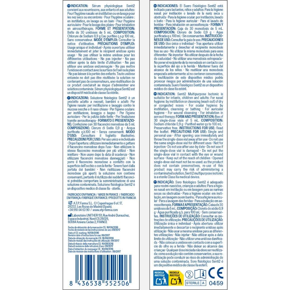 Lavar cuidadosamente as mãos antes de usar. Descolar um recipiente monodose e abri-lo girando sua parte superior. Para a higiene nasal e ocular. Pode ser utilizado diariamente para a higiene nasal e ocular, de 1 a 6 lavagens por dia, dependendo das necessidades. Para a higiene do nariz: por instilação ou lavagem do nariz seco ou obstruído. Incline a cabeça para um lado. Introduza delicadamente a ponta aberta na narina e aperte levemente a monodose. Repita a operação na outra narina. Levante a cabeça para deixar escorrer a mucosidade e seque o excesso. Não assoe violentamente durante os 10 minutos seguintes à administração. Em lactantes, instile o produto com a mínima pressão para evitar qualquer risco de contaminação do ouvido médio. Para a higiene dos olhos: por instilação, lavagem ou banho. Derrame algumas gotas de solução em cada olho. Seque o excesso de líquido com uma compressa estéril. Não coloque o recipiente da monodose em contato com a superfície do olho. Em caso de utilização de outro produto de uso ocular, comece com Soro Fisiológico Senti2 e espere 15 minutos antes da instilação. A solução é compatível com o uso de lentes de contato. Para a higiene auricular. Em enxágue. Para uma perfeita higiene auricular, após aplicar uma solução tensoativa auricular, utilize o produto para evacuar os depósitos solubilizados de cerúmen e enxaguar o canal auditivo externo. Um recipiente monodose pode ser utilizado nas 2 orelhas. Seque o excesso de líquido com uma compressa. Para a lavagem de feridas. Enxágue a ferida utilizando toda a solução contida na monodose. Seque o excesso de líquido apenas sobre a pele saudável. Não coloque o recipiente da monodose em contato com a superfície da ferida. Para a inalação em aerosolterapia. Se a solução for utilizada como solvente para inalação em aerosolterapia, consulte as instruções indicadas no produto a ser inalado. Se a solução for utilizada sozinha, consulte as instruções indicadas no aparelho de aerosolterapia. Consulte seu médico em caso de primeira utilização ou em caso de hipersensibilidade respiratória.