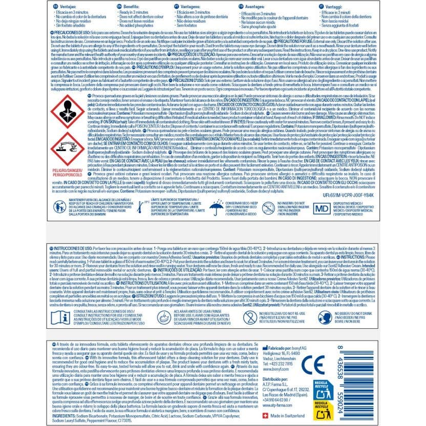 Somente para uso externo. Descarte a solução após o uso. Não use as tabletes se você for alérgico a algum ingrediente ou aos persulfatos. Não coloque a tablete na boca. O pó das tabletes pode causar danos aos olhos. Não beba a solução nem a use como enxaguante bucal. Enxágue bem sua prótese dentária antes de usar. Pare de usar as tabletes e procure um médico se você sofrer irritação, inchaço ou dor após o primeiro uso ou em qualquer uso posterior. Consulte as instruções de uso. Mantenha em local seco. Produto de uso único. Notifique qualquer incidente grave ao fabricante e à autoridade competente do seu país.