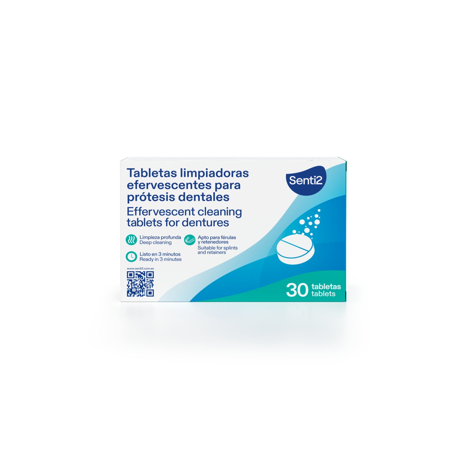 Senti2 Tabletes Limpiadoras prótese Dental 30 uds são tabletes limpadores efervescentes que proporcionam uma agradável sensação na boca após o uso, graças ao seu sabor agradável de menta.