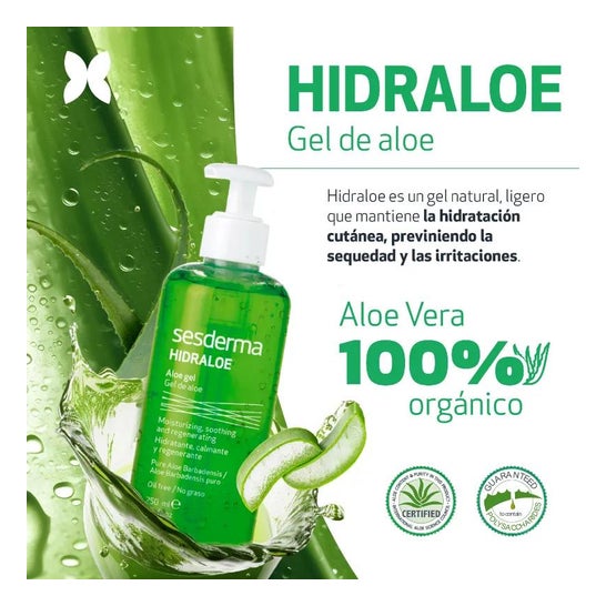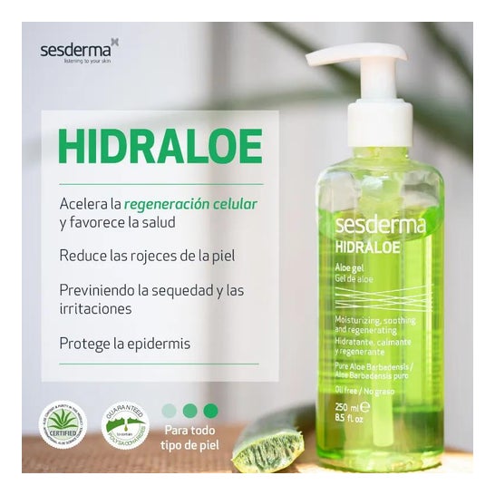 Sesderma Hidraloe Aloe Gel 250ml é um gel hidratante e refrescante com propriedades calmantes e protectoras para a pele, adequado para depois da exposição solar, do barbear e da depilação.