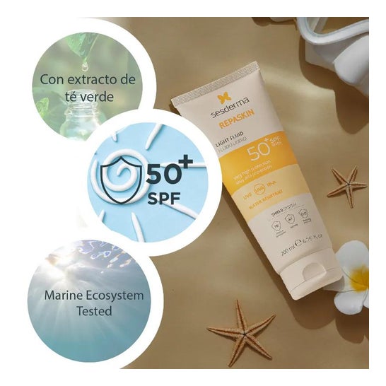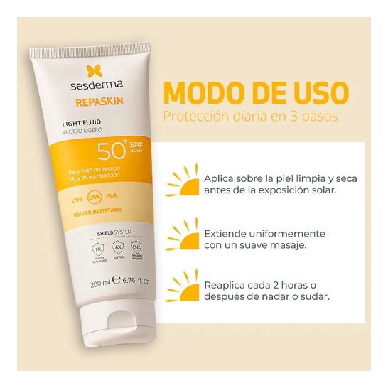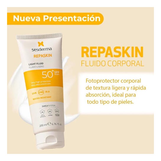 Sesderma Repaskin Protetor Solar Corporal Fluido Leve SPF50 200ml é um protetor solar facial com textura em gel que ajudará a proteger a pele quando você se expuser ao sol. Este protetor solar, adequado para todos os tipos de pele, criará uma barreira fotoprotetora na sua pele enquanto a protege contra os danos no DNA celular.