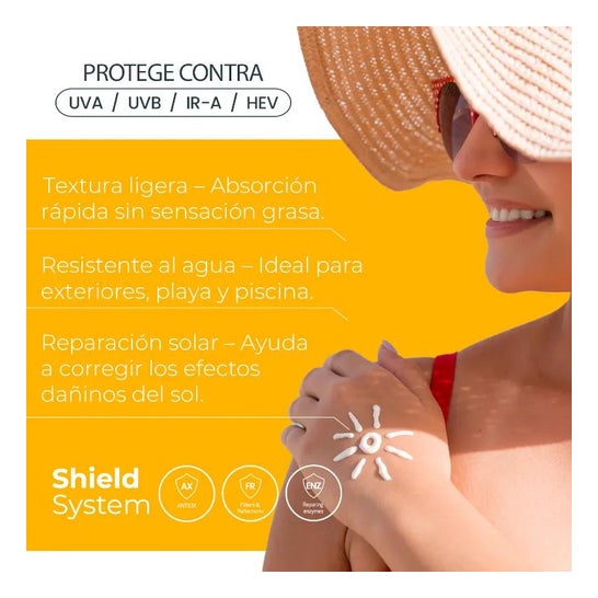 Sua fórmula contém extrato de plâncton, enzimas reparadoras que se ativam com a luz solar visível e que garantem a máxima proteção junto aos filtros físicos e químicos SPF50+. Além disso, contribui para criar uma barreira fotoprotetora que protege a pele contra os danos no DNA celular.