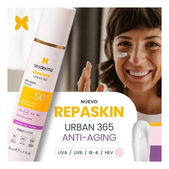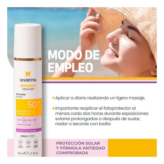 Sesderma Repaskin Urban 365 Antienvelhecimento SPF50 50ml é um fotoprotetor antienvelhecimento de uso diário que ajuda a proteger a pele e prevenir os sinais de fotoenvelhecimento como linhas de expressão e/ou manchas.