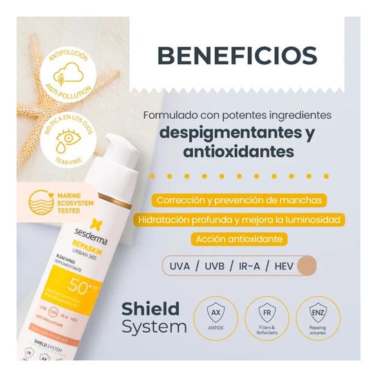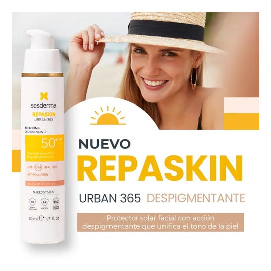 Sesderma Repaskin Urban 365 Despigmentante SPF50+ 50ml é um protetor solar despigmentante que ajuda a unificar o tom da pele e previne o fotoenvelhecimento cutâneo e repara o dano celular.