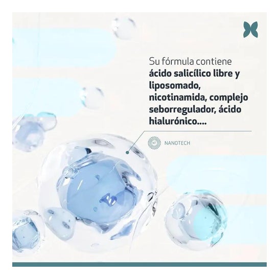 Feito com ácido salicílico livre e lipossómico, nicotinamida, um complexo regulador de sebo que regula a secreção de óleo que provoca anomalias na pele facial. Além de sais de zinco, aloé vera, solução calmante, ácidos boswelicos e ácido hialurónico, que estimula a síntese de colagénio e ajuda a reduzir o aparecimento dos sinais de envelhecimento.