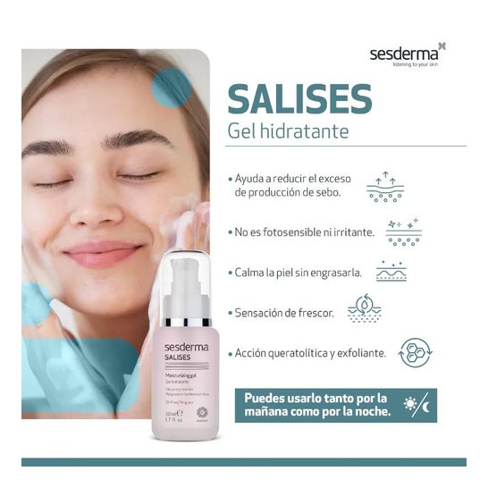 Sesderma Salise Gel Hidratante 50ml é um gel que ajuda a regular a secreção sebácea e, portanto, a prevenir e reduzir o aparecimento de acne.