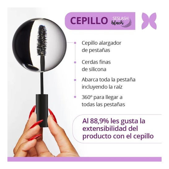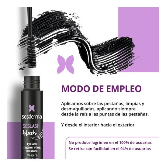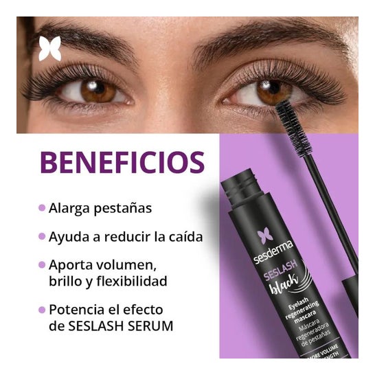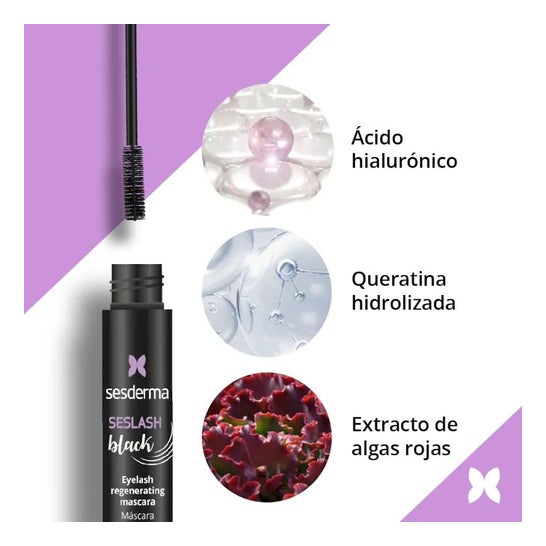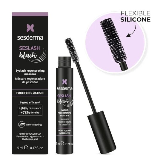 Sesderma Seslash Black Eyelash Regenerating Mascara 5ml é um rímel com pigmentos pretos que ajuda a regenerar as pestanas e a fortalecê-las. Também ajuda a reduzir a perda de pestanas e a adicionar volume e comprimento. Contém um complexo fortificante de queratina hidrolisada e extrato de algas vermelhas. Contém igualmente ácido hialurónico e glicerina.