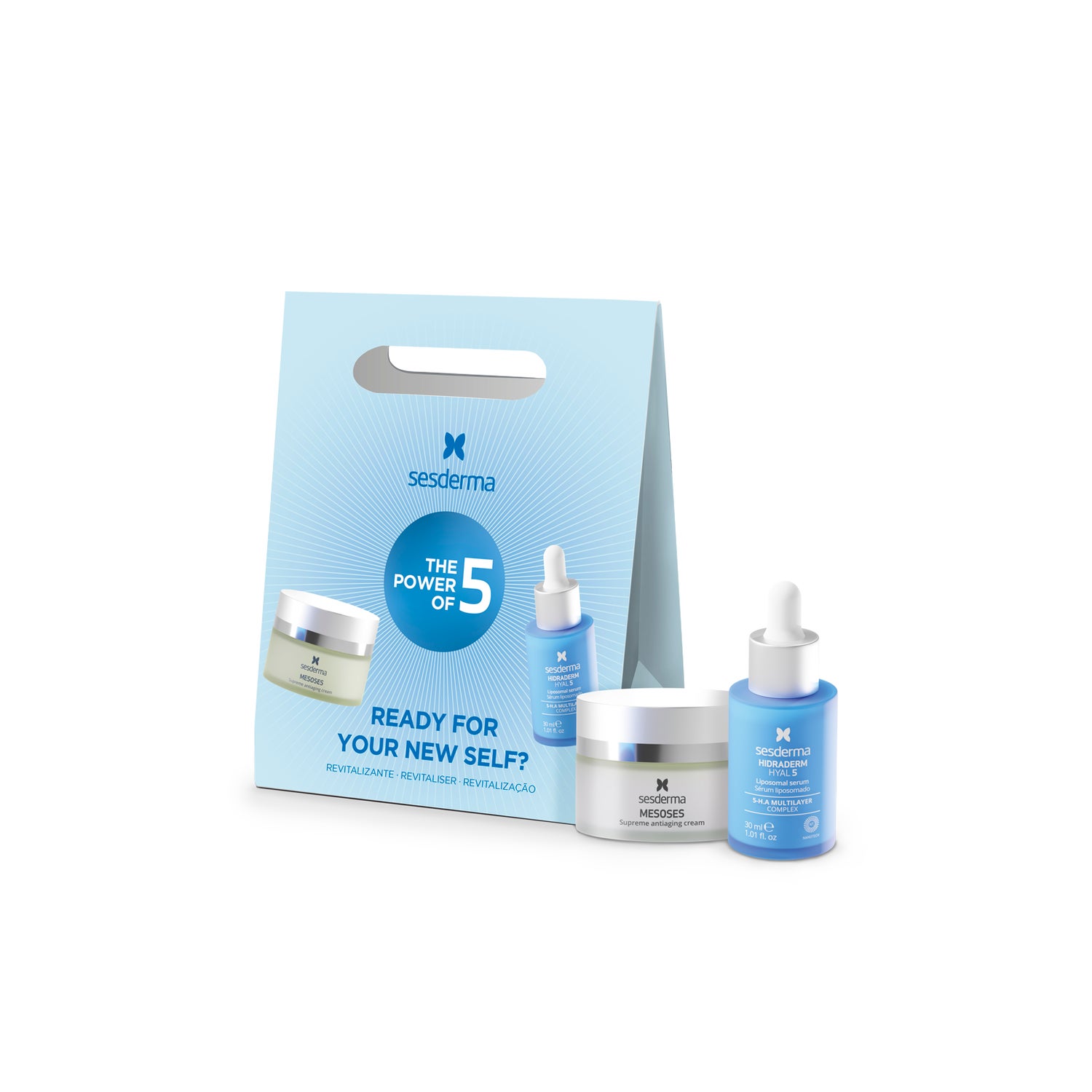 Sesderma The Power Of 5 Pack Mesoses + Hidraderm Hyal 5 Serum é um conjunto projetado para fornecer um tratamento intensivo e completo para a pele. Este pack inclui: