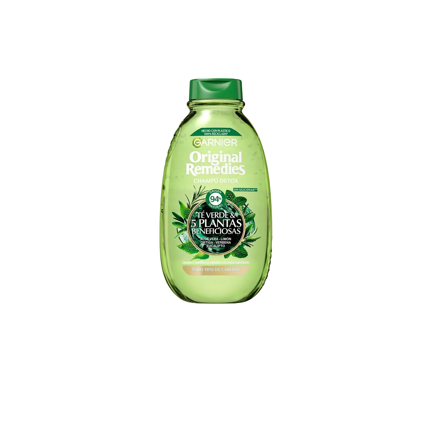 Garnier Original Remedies Green Tea & 5 Plants Detox Shampoo 300 ml é um champô desintoxicante que contém aloé vera, limão, verbena, eucalipto e urtiga para limpar e purificar o couro cabeludo. Dá brilho, luminosidade e saúde ao cabelo. Ideal para todos os tipos de cabelo e para uso diário. Sem silicone.