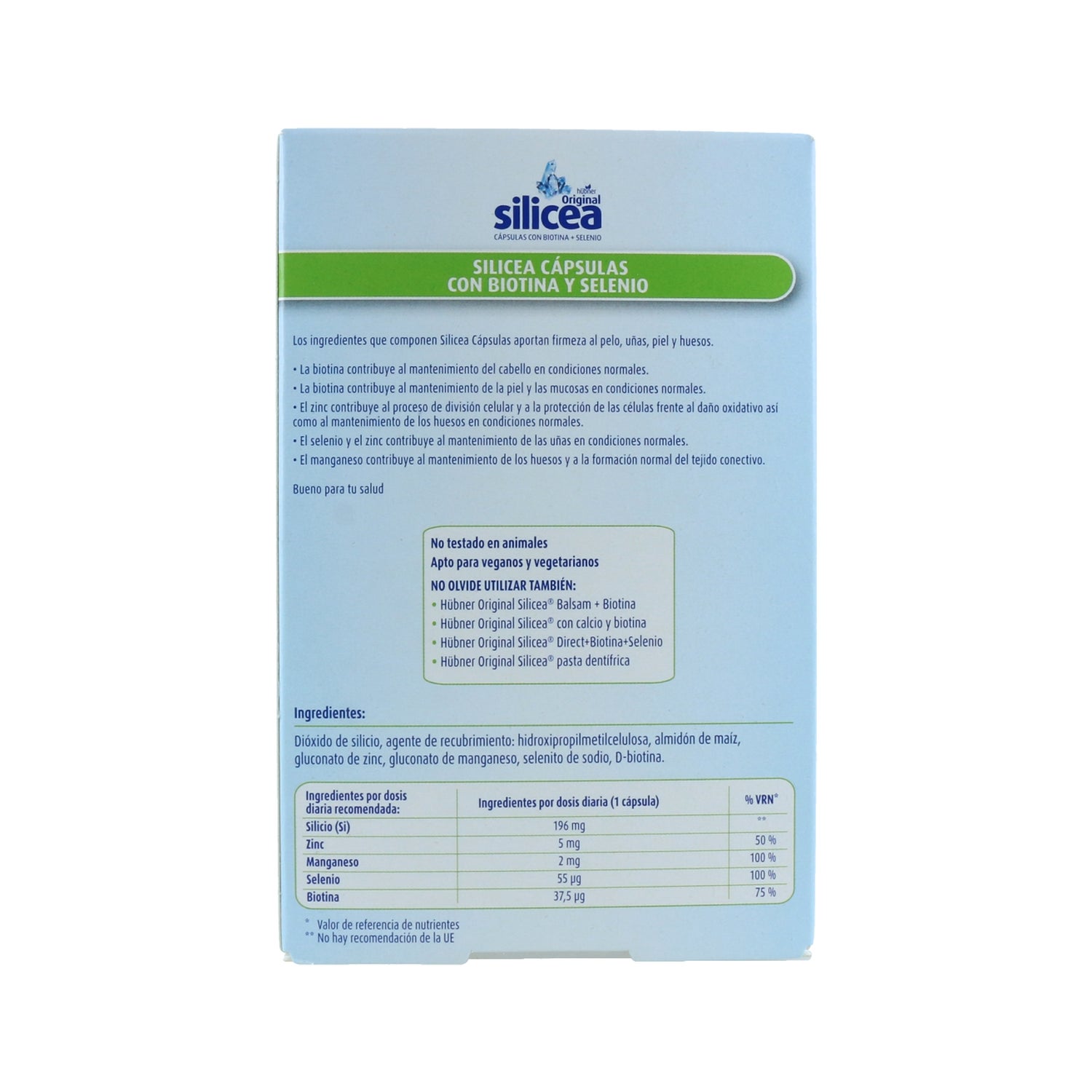 Hübner Silicea + Biotina + Selênio 30 caps. é um suplemento alimentar que proporciona um alto teor de silício ao corpo, ideal para fortalecer a pele do tecido conjuntivo, unhas e cabelos. Cada cápsula fornece sílica pura biodisponível, biotina, selénio, zinco e manganês. Ao tomar estas cápsulas por um período prolongado de tempo, obtém uma pele suave e brilhante, cabelo forte e brilhante e unhas duras e resistentes.
