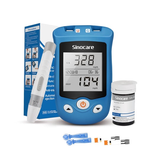 Kit Glucômetro Sinocare 2 em 1 Glicose Ácido Úrico + 25 Tiras é um dispositivo projetado para facilitar a monitorização dos níveis de glicose e ácido úrico no sangue. Seu design ergonômico garante uma experiência confortável e sem dor, contando com nove configurações de profundidade que minimizam o desconforto durante o processo de obtenção de amostras.