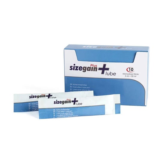 Sizegain Plus Lube é um lubrificante íntimo à base de água com efeito refrescante. Actua como um revigorante e maximiza o prazer graças ao seu grande poder lubrificante. Estes lubrificantes de dose única vêm numa caixa de 10 saquetas de 5 ml cada. Leve-os para onde quiser, é muito discreto e higiénico.