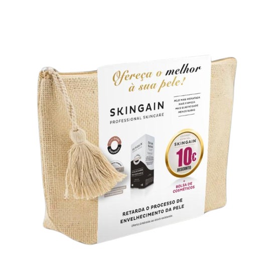 Skingain Set Pó 30 Saquetas + Bolsa de Cosméticos é um suplemento alimentar projetado para contribuir para a saúde e aparência da pele. Contém uma combinação de colágeno tipo I e II em uma concentração de 10.000 mg, o que traz benefícios significativos na redução dos sinais visíveis do envelhecimento.