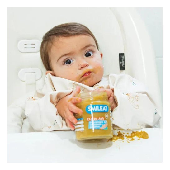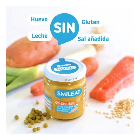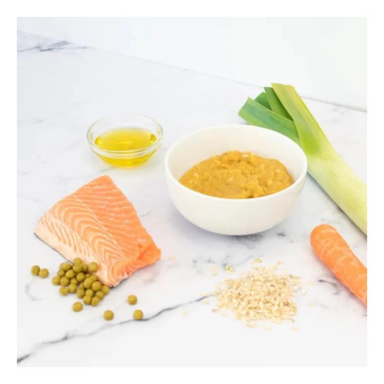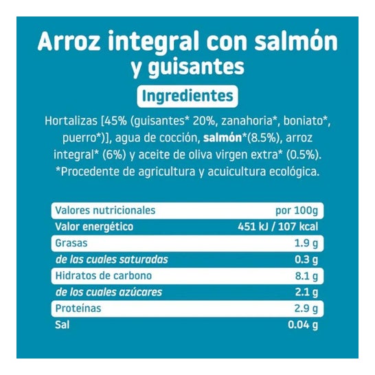 Frasco de alimentos orgânicos apresentados em pedaços. Adequado para cultivar comida para bebé. Recomendado para idades mais velhas para ajudar no desenvolvimento psicomotor, introduzindo novas texturas. É composto por uma receita com um sabor equilibrado de peixe, salmão e pequenos pedaços de arroz marrom não triturado. Tem também uma variedade de ingredientes vegetais como batata, alho francês, ervilhas, cenoura, cebola e azeite extra-virgem.