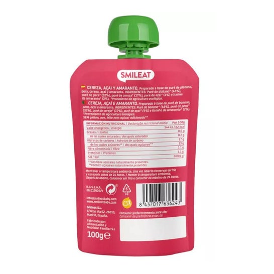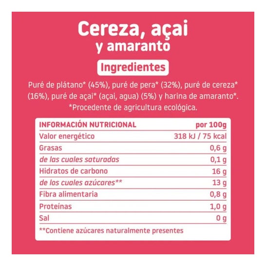 Pacote bebível composto por cereja, açaí e amaranto, perfeito para pequenos-almoços, lanches ou lanches para crianças a partir dos 8 meses de idade. Sua textura suave e fácil de beber favorece o desenvolvimento nutricional dos pequenos, pois não contém leite, glúten de ovo, aditivos ou açúcares adicionados. Além disso, as embalagens de origem vegetal são amigas do ambiente.