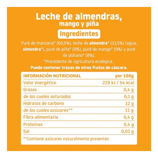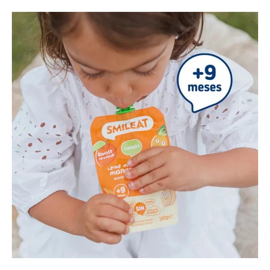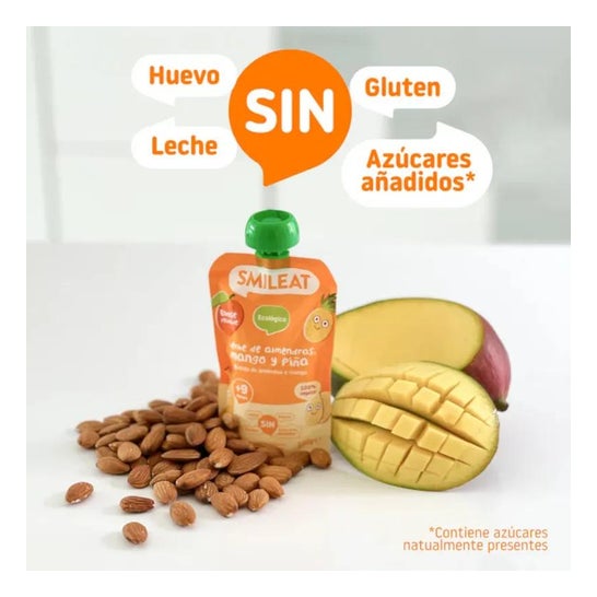 Smileat Pouch Almond Manga e Abacaxi Eco 100g é um snack com ingredientes 100% orgânicos. É um puré feito com leite de amêndoa, banana, milho, ananás e manga. Ideal para pequenos-almoços e petiscos. Sem glúten e sem adição de açúcares.