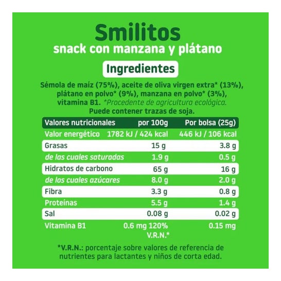 Smileat Smilitos de Maçã e Banana Bio 25g são snacks assados com um delicioso sabor a maçã e banana, ideais para que as crianças desfrutem em qualquer momento. Estão recomendados a partir dos 8 meses e elaborados completamente com ingredientes ecológicos como milho e azeite de oliva virgem extra. São livres de glúten, ovo, sal e não contêm açúcares adicionados. Além disso, estes Smilitos contêm vitamina B1 para uma alimentação equilibrada e saudável.