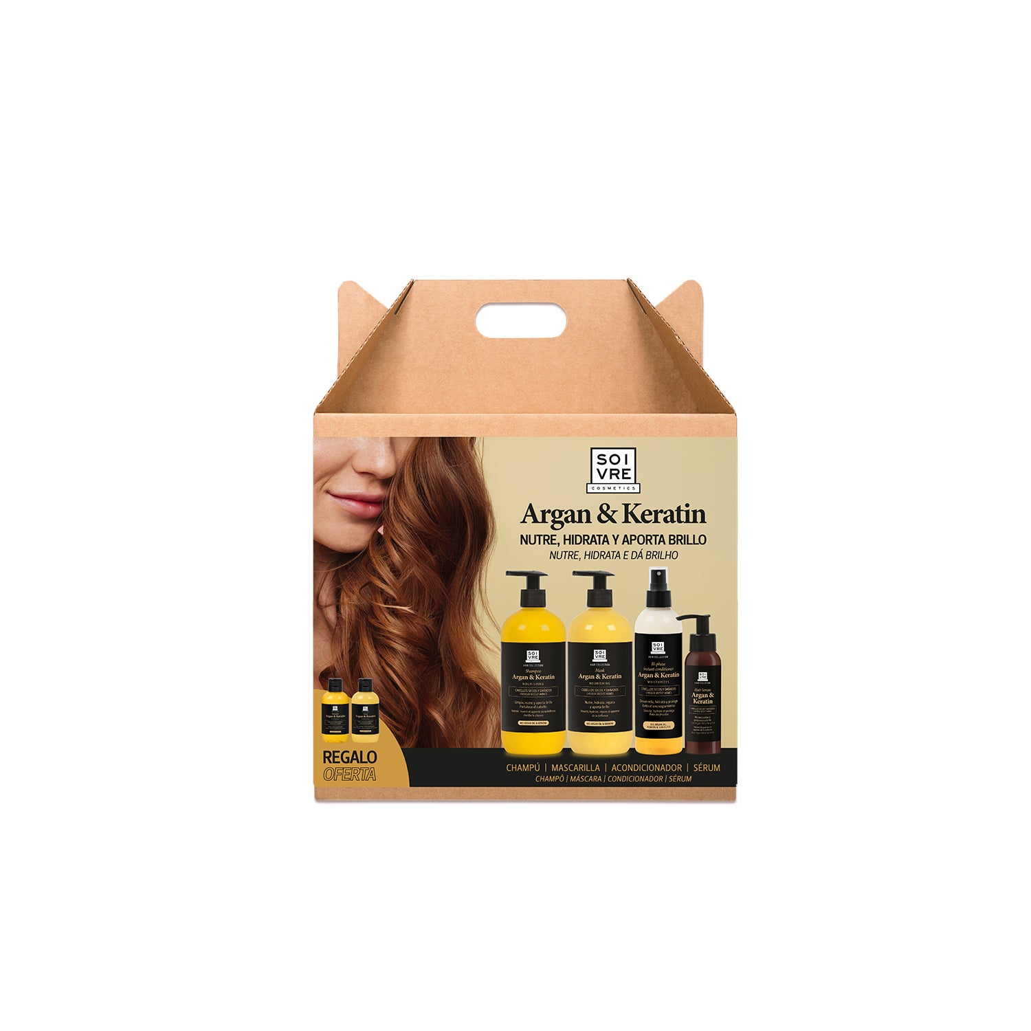 Pacote de cabelo com óleos vegetais. Adequado para embelezar e regenerar cabelos enfraquecidos. Inclui um tratamento intensivo, que favorece a aparência e a flexibilidade a partir do interior. Um champô com argan e queratina, que proporciona higiene, brilho e hidratação. Uma máscara que nutre e repara as extremidades. Um condicionador bifásico que se desacopla e tem um filtro solar. E um soro para um acabamento perfeito.