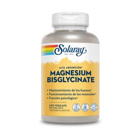 Solaray Magnésio Bisglicinato 240 Vegcaps é um suplemento em cápsulas vegetais que fornece magnésio ligado à glicina, uma apresentação conhecida por sua elevada biodisponibilidade e boa absorção.