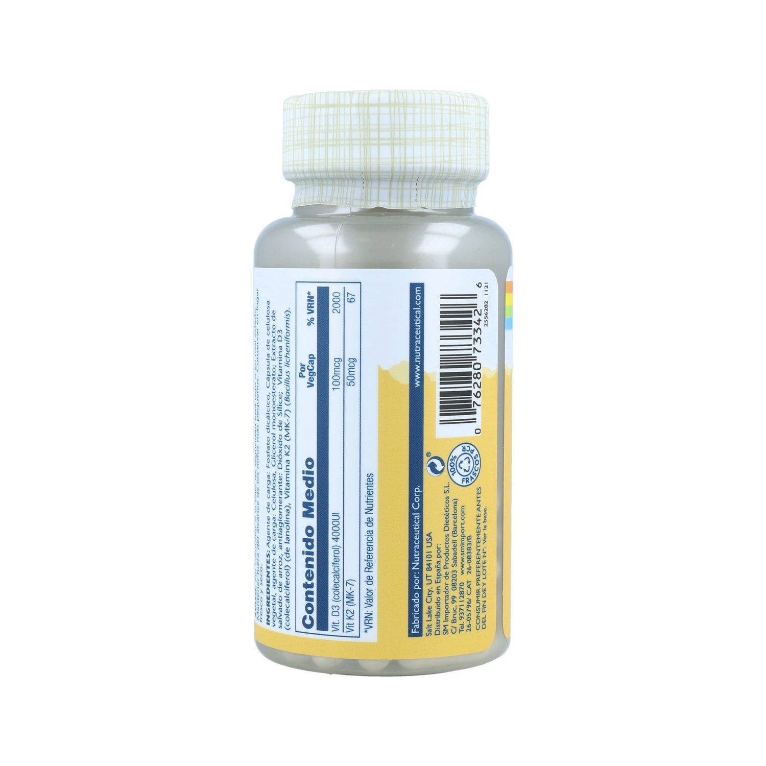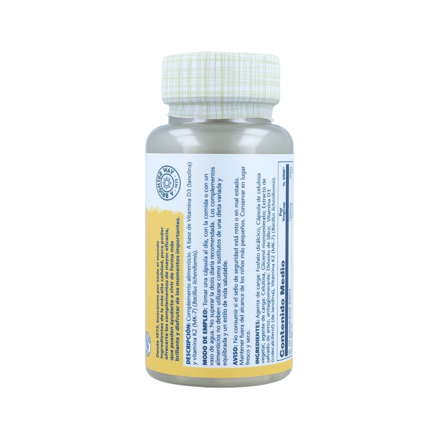 Solaray Vitamina D3+K2 60capsé um suplemento alimentar em cápsula que contribui para a manutenção adequada dos ossos, dentes e saúde cardiovascular.