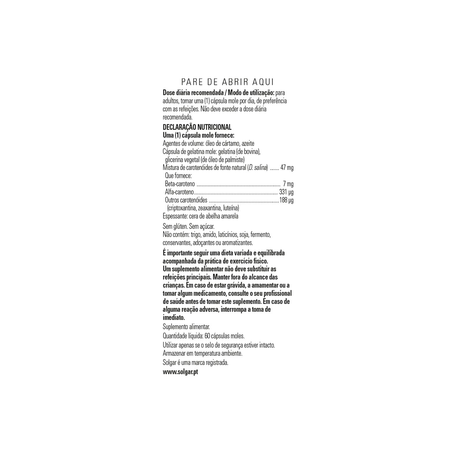 Solgar Beta-Caroteno 60 pérolas é um suplemento alimentar que fornece beta-caroteno e outros carotenóides provenientes de uma microalga verde que vive nos pântanos salgados marinhos.