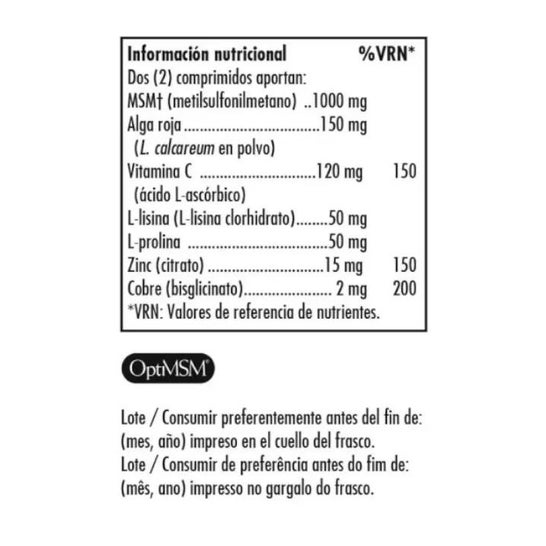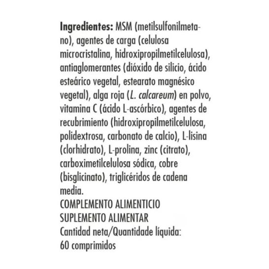 MSM (METILSULFONILMETANO) 1000 MG; ALGAS VERMELHAS (L. CORALLIOIDES) 150 MG; VITAMINA C (ÁCIDO ASCÓRBICO) 120 MG; L-LISINA (COMO CLORIDRATO) 50 MG; L-PROLINA 50 MG; ZINCO (CITRATO) 15 MG; COBRE (GLICINATO) 2 MG. OUTROS INGREDIENTES NATURAIS PRESENTES: CELULOSE MICROCRISTALINA, ÁCIDO ESTEÁRICO VEGETAL, ESTEARATO DE MAGNÉSIO VEGETAL, DIÓXIDO DE SILÍCIO, GOMA DE CELULOSE, HIDROXIPROPILMETILCELULOSE, GLICERINA VEGETAL