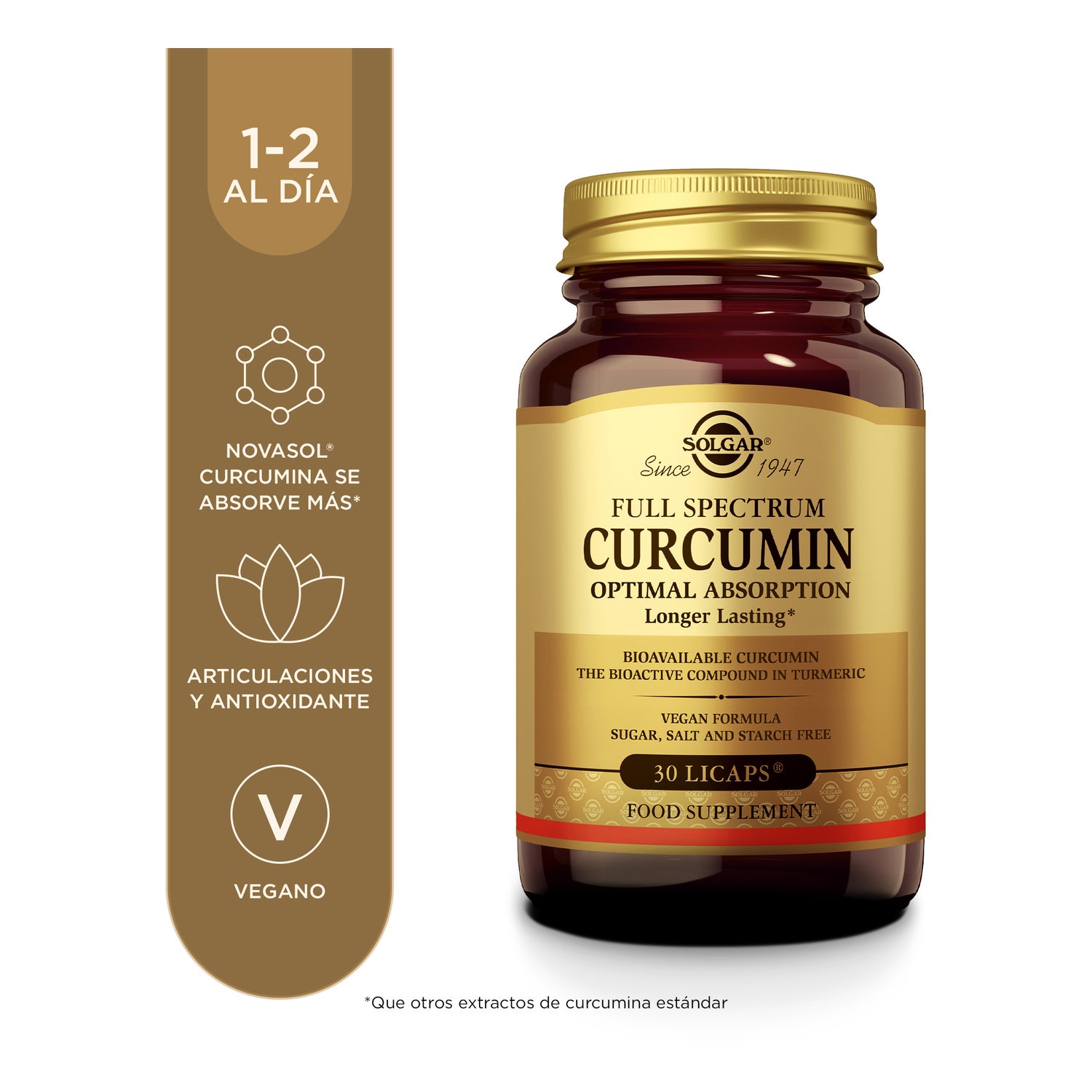 Solgar Full Spectrum Cúrcuma 30 pérolas é um suplemento alimentar com curcumina NovaSOL®, uma forma solubilizada de extrato de cúrcuma que melhora notavelmente sua absorção em comparação com os extratos tradicionais.
