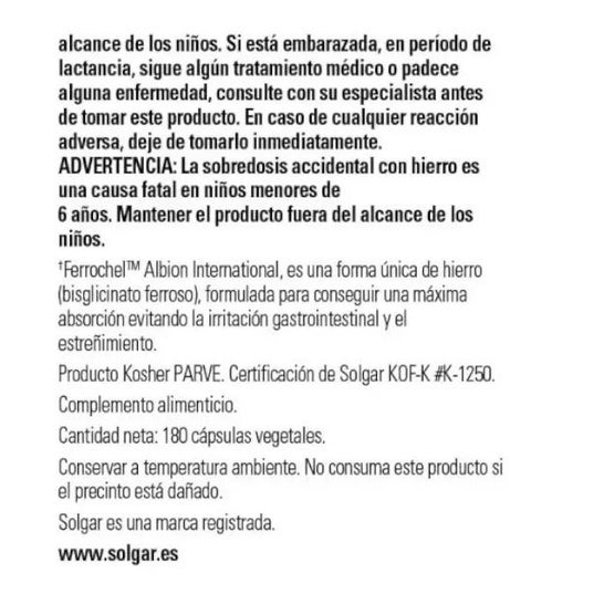 Solgar Iron Bisglycinate 20mg 180caps é um suplemento alimentar vegan com uma forma altamente absorvível de bisglicinato de ferro que minimiza o desconforto gastrointestinal.