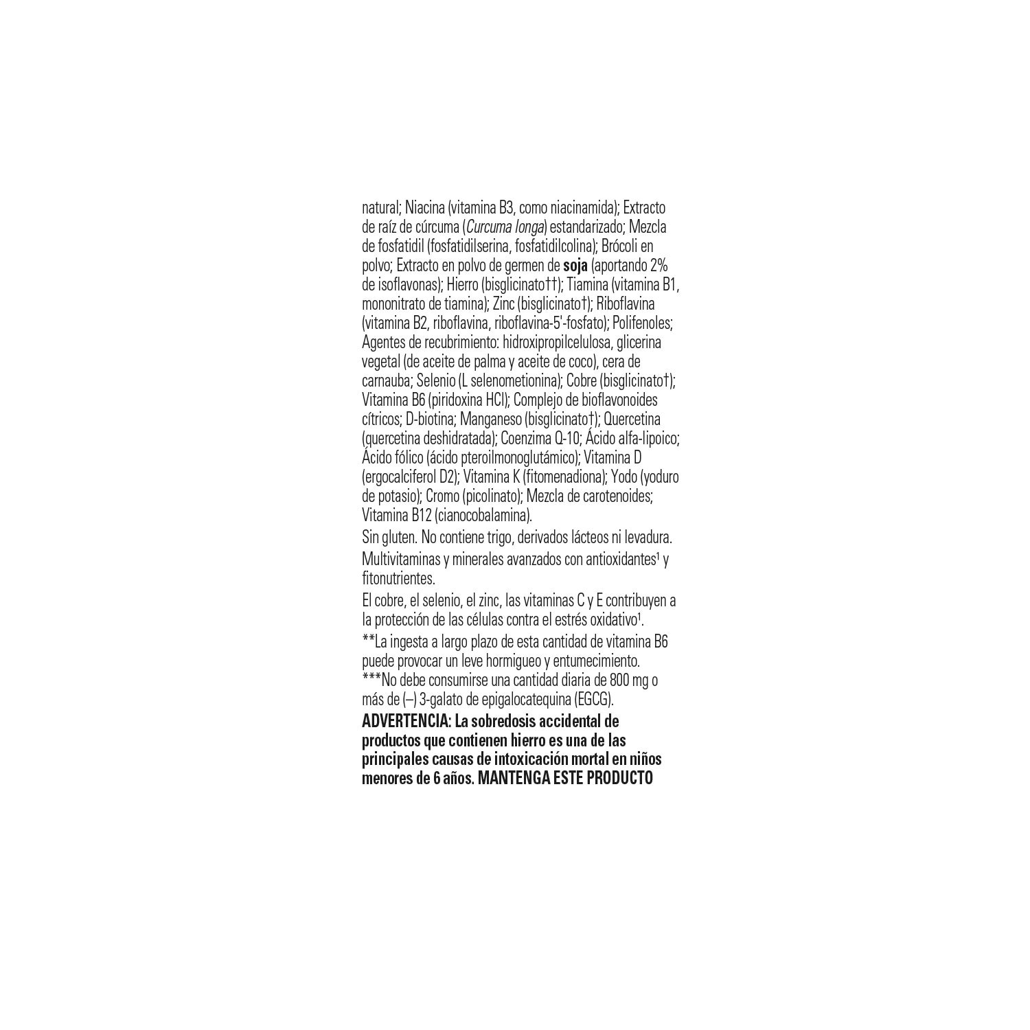 A sua fórmula multi-nutriente contém vitaminas e minerais, e é rica em antioxidantes e fitonutrientes, e permite a máxima absorção e biodisponibilidade, evitando problemas gastrointestinais.