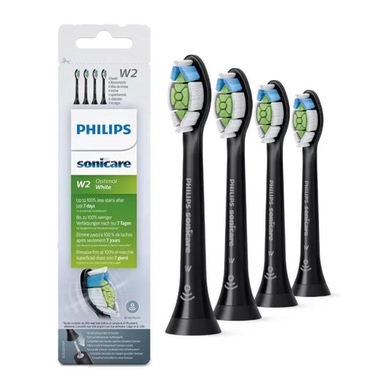 Cabeças de escova de substituição para as escovas de dentes eléctricas Philips Sonicare de terceira geração. Têm fibras densas especiais na parte central, com a forma de um diamante lapidado, que ajudam a remover até as mais pequenas manchas superficiais de resíduos de alimentos e bebidas da superfície dos dentes. Graças à tecnologia sónica da escova, estas cabeças de escova facilitam a limpeza dos espaços interdentários e da linha das gengivas. Cor preta. Embalagem com 4 cabeças de escova de substituição.