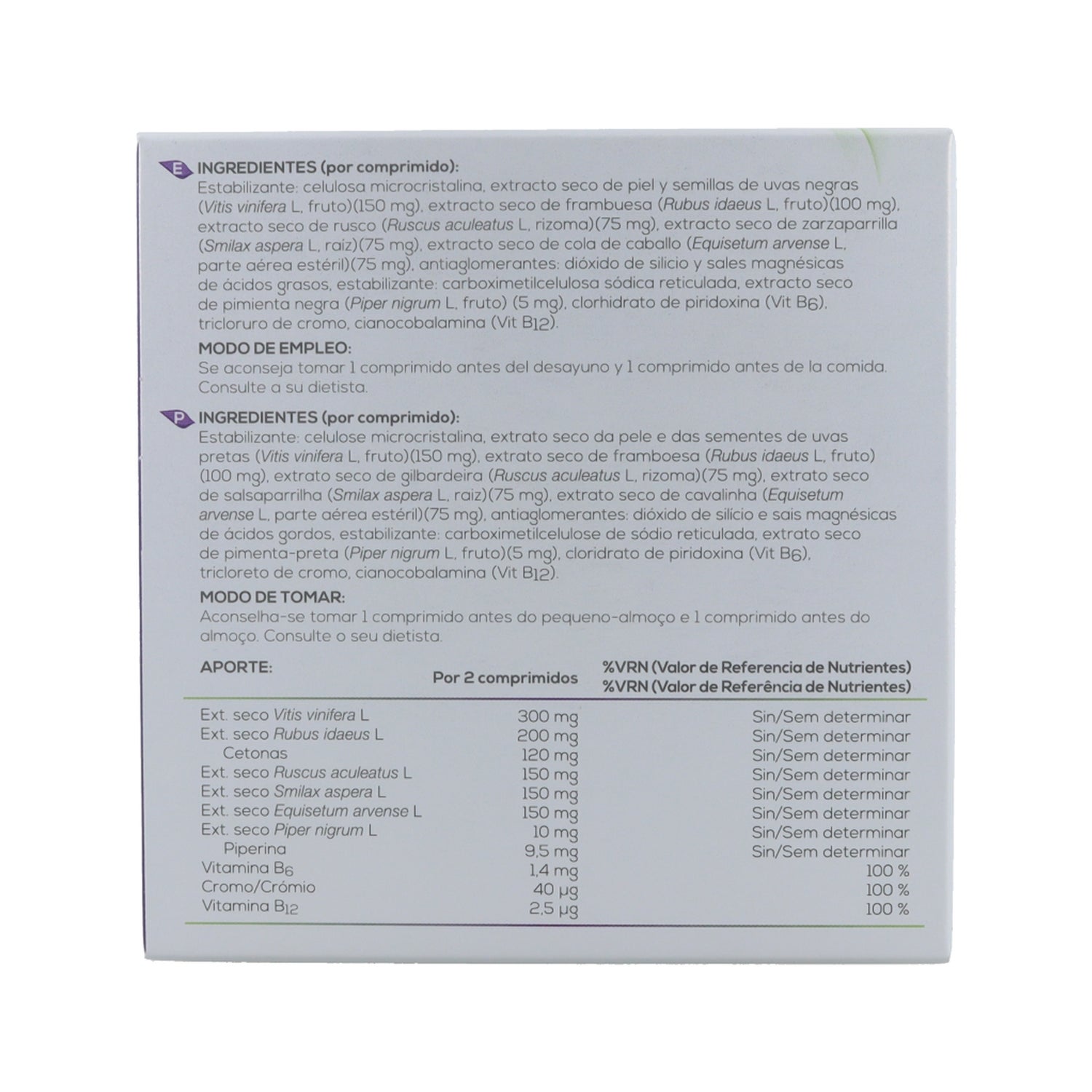 SUMO DE PELE DESIDRATADA, SEMENTES DE UVA PRETA, CETONAS DE FRAMBOESA, EXTRACTO CONCENTRADO DE VASSOURA DE TALHO, EXTRACTO CONCENTRADO DE SALSAPARRILHA, EXTRACTO CONCENTRADO DE CAVALINHA, VITAMINA B6, TRICLORETO DE CRÓMIO E VITAMINA B12.