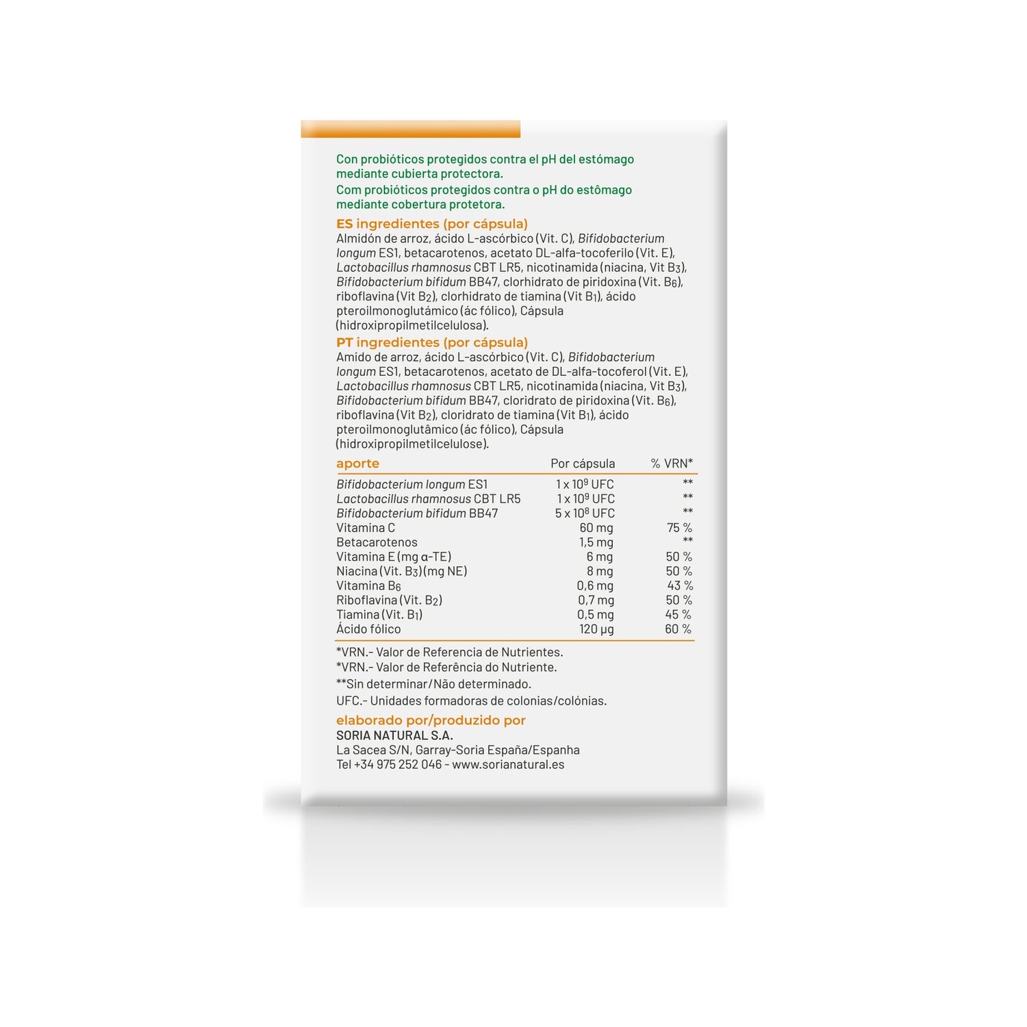 Suplemento alimentar formulado com probióticos. Contém a estirpe bacteriana Bifidobacterium longum ES1. Contribui para o correto funcionamento do sistema digestivo. Indicado em casos de inflamação intestinal ou doença celíaca. Não adequado para alergias à proteína do leite, mulheres grávidas ou em período de amamentação.