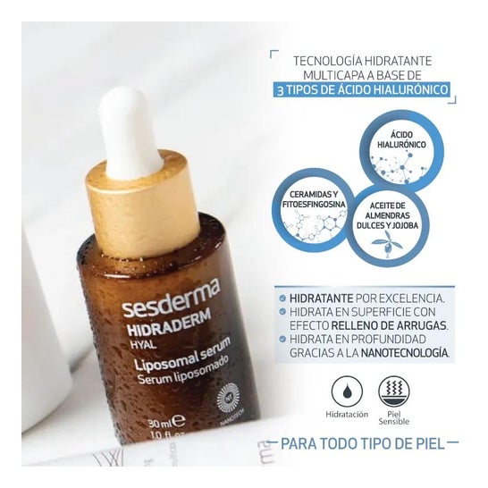 Hidraderm Hyal Liposomed Serum é uma solução rica em ácido hialurónico que ajuda a hidratar a pele ao mesmo tempo que exerce uma acção anti-envelhecimento sobre a tez. Este soro é adequado para todos os tipos de pele, mesmo a mais sensível.