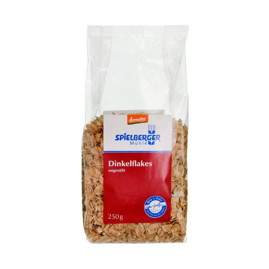 Flocos de espelta biológicos elaborados através de um processo tradicional de laminação: o grão inteiro de espelta, depois de cozido, é enrolado e torrado. Pode ser combinado com leite, iogurte, fruta fresca, ou utilizado em receitas de pastelaria. Estes flocos ajudam a manter uma dieta rica em fibras e com baixo teor de gordura. Não contém açúcar nem glúten.
