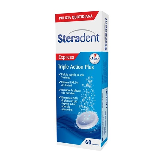 Steradent Triple Action Plus Cleaner 60 comprimidos são comprimidos efervescentes que facilitam a limpeza das dentaduras e ajudam a mantê-las em boas condições e a prevenir infecções na boca.