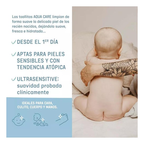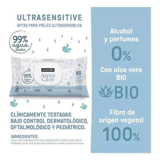 Suavinex Aqua Care Toalhetes 60uds são toalhetes ultra-sensitivos compostos principalmente por água, ideais para bebés com peles muito sensíveis e propensas a dermatite atópica. Estão livres de álcool e perfume, e contêm aloe vera biológica e fibra de origem vegetal 100%. Foram clinicamente testados e recomenda-se não os deitar no vaso sanitário após a utilização. Adequados desde o primeiro dia de vida.