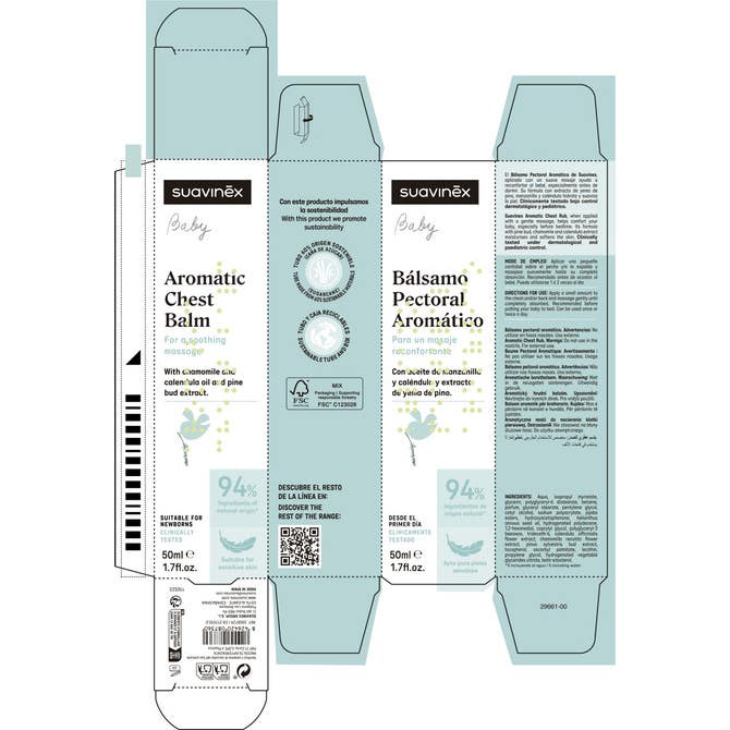 Suavinex Bálsamo Pectoral Aromático 50 ml é um produto projetado para proporcionar uma massagem reconfortante que contribui para o bem-estar do bebê. Este bálsamo é composto em 95% por ingredientes de origem natural, o que o torna ideal para peles sensíveis e apto desde o primeiro dia de vida.