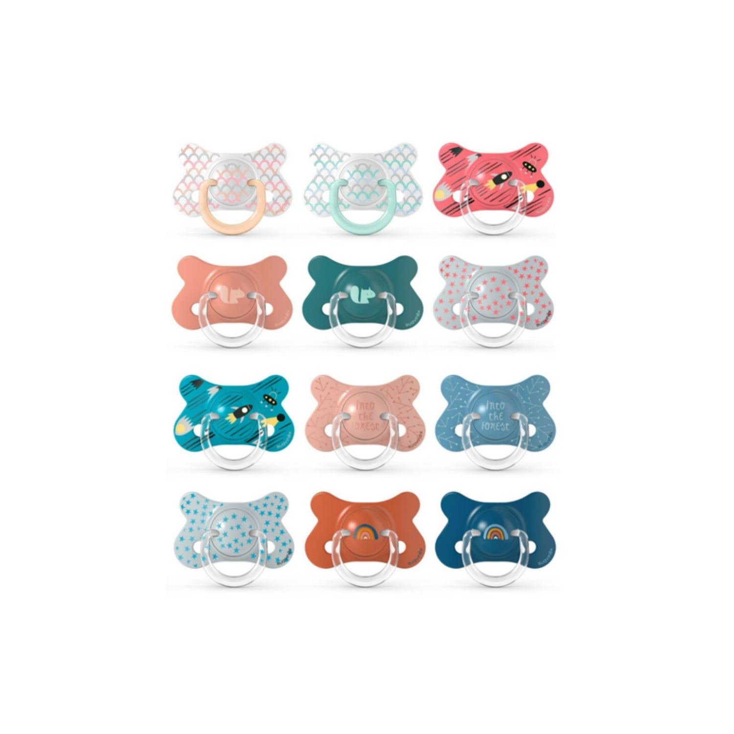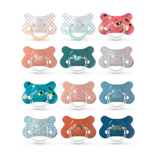 Chupeta com uma chupeta fisiológica elaborada com silicone que se adapta à cavidade bucal do pequeno para facilitar seus movimentos naturais e não deformar sua boca.