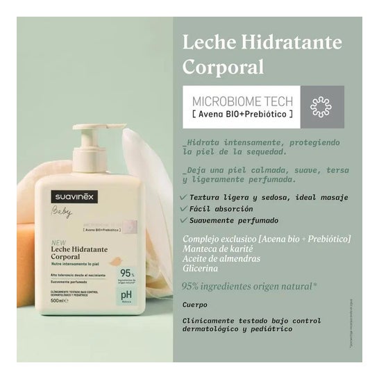 Suavinex® Moisturizing Massage Lotion é feito principalmente de produtos naturais, incluindo bálsamo de limão, com propriedades relaxantes conhecidas. Após o banho, o bebé pode receber uma massagem relaxante com a loção de massagem hidratante, ajudando não só a assegurar que a sua pele é cuidada e equilibrada, mas também a ficar muito mais relaxado e descansado para dormir.