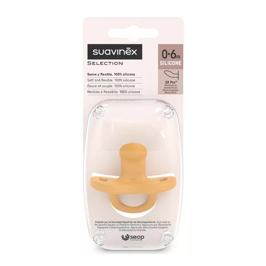 Suavinex Chupete Todo Silicona Fisio 0-6M 1ud é uma chupeta com uma tetina fisiológica de silicone que mantém a língua na mesma posição fisiológica/natural que quando o bebé mama ao peito. Ideal para dormir, forma simétrica. Com um pescoço mais fino, que permite ao bebé fechar a boca quase completamente.