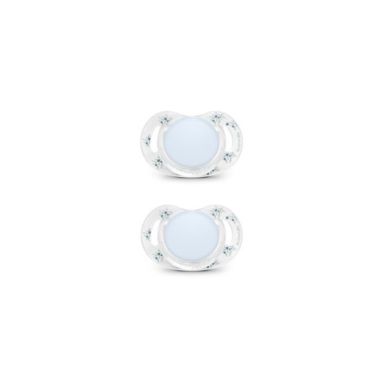O chupete apresenta uma aro transparente, que lhe confere um estilo minimalista e exclusivo. Sua chupeta, de forma plana e simétrica, assegura que se mantenha na posição adequada na boca do bebê. Esta característica foi aprovada pela Sociedade Espanhola de Odontopediatria, o que garante sua adequação para o desenvolvimento oral do pequeno.