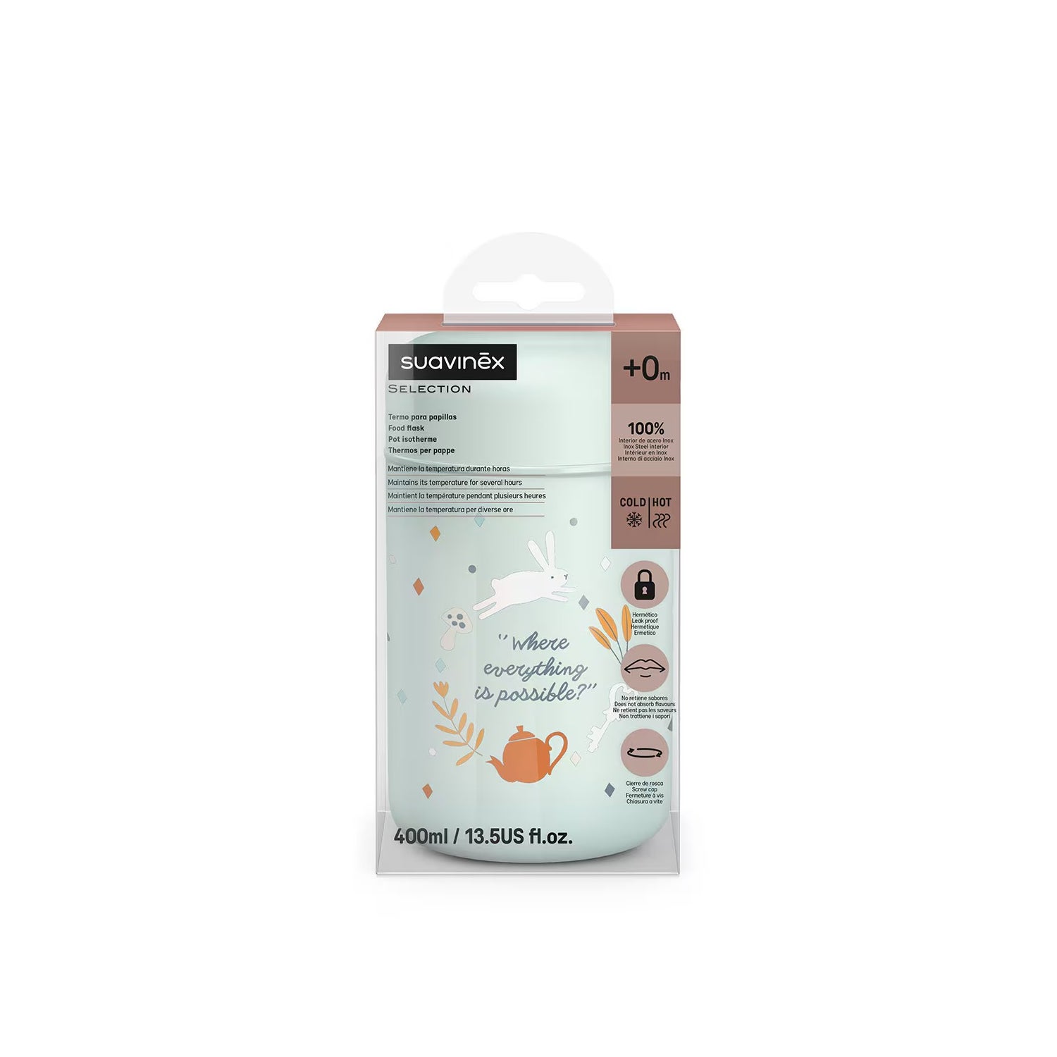 Suavinex Termo Para Papilla 400ml é uma garrafa térmica para alimentos sólidos de Suavinex que lhe permite transportar alimentos para bebés quentes e frios, mantendo a sua temperatura por várias horas.