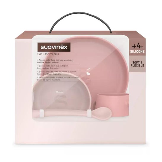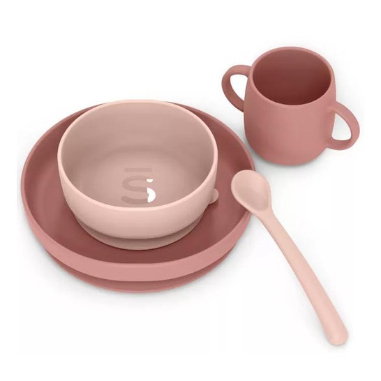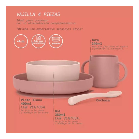 Louça de mesa para crianças feita de silicone de qualidade alimentar e pigmentos de segurança alimentar, incluindo um prato, uma tigela e uma colher. Foi concebida para facilitar a transição para alimentos sólidos para os mais pequenos. A louça de mesa é durável, fácil de limpar e segura para bebés a partir dos 6 meses.